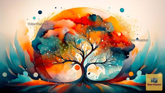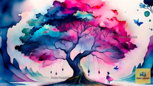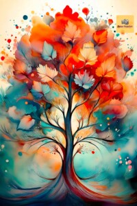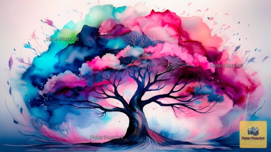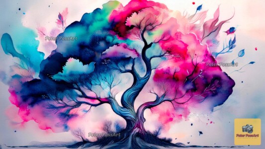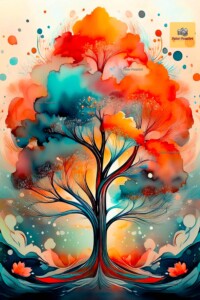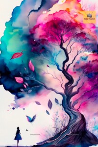 Umgeben von einem schillernden Regenbogen, der ein Kaleidoskop unendlicher Möglichkeiten offenbart, stehen diese Bäume nicht nur als ein gewöhnliches Naturwunder – sie sind das pulsierende Herzstück des Wachstums, der Transformation und des ewigen Lebenszyklus!