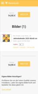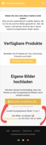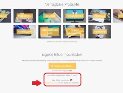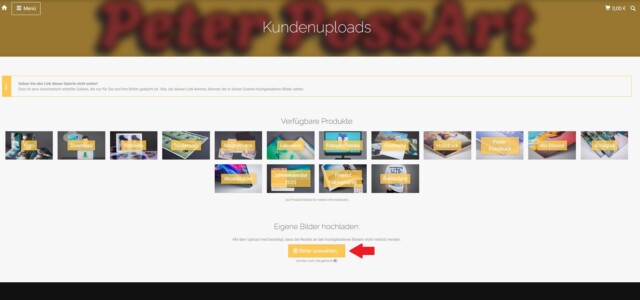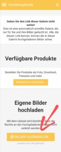 Dann seid ihr schon im Kunden-Uploads Bereich und könnt beim Button „Bilder auswählen…“ eure Bilder, Fotos, Grafiken hochladen. Bei „Verfügbare Produkte“ könnt ihr die Produktinformation lesen. (siehe, klick Bild ⬇)