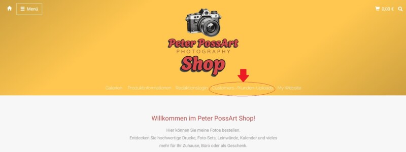 Gebt im Browser folgende Adresse ein bzw. klick auf den Link: www.peterpossart-shop.de/upload ODER von meinem Shop aus auf die Rubrik „Customers-/Kunden-Uploads„. (siehe, klick Bild ⬇)