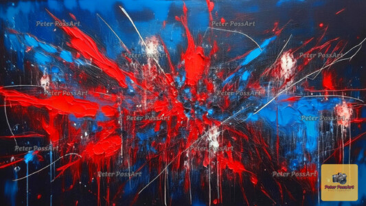 Die lebendige Dynamik der Farben und die fesselnde Komposition laden uns dazu ein, in eine pulsierende Welt einzutauchen, die nur so vor Energie und unermüdlicher Kreativität strotzt. Jeder Strich und jeder Klecks ermutigt uns, die Schönheit und die Komplexität unserer Emotionen noch tiefer zu erforschen.